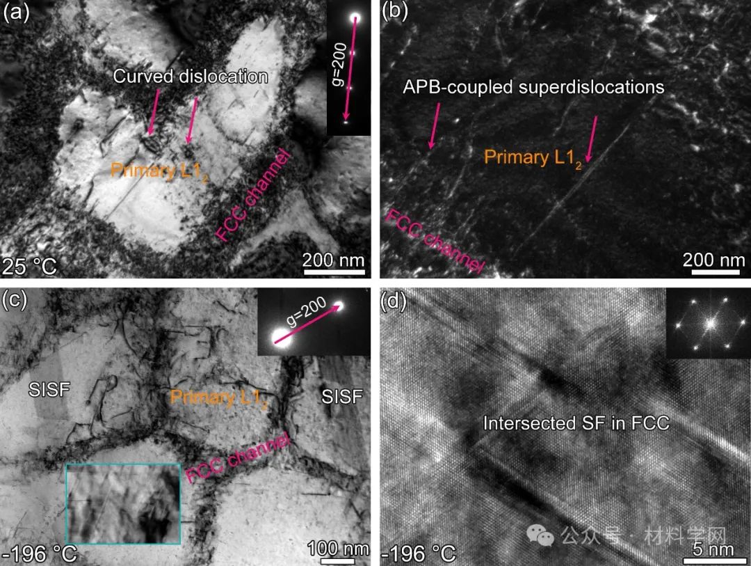 为此,香港城市大学杨涛教授领衔的研究团队基于多主元合金设计方法与热处理调控获得了一种宽温域范围内(-196~1000 °C)均具有优异综合强韧性的析出强化高熵合金。通过向非等原子比FeCoCrNi基体中引入较高含量的Ti, Al, Ta, W, Nb等L12形成元素,促进大量与FCC 基体共格的多组元L12纳米颗粒的析出,L12密度高达58.5%,同时具有较高的固溶温度约为1165 °C。从而保证了该合金从低温到高温能维持较高的强度,另一方面通过合理控制Co元素添加,稳定纳米颗粒,并降低合金的层错能,从而激发在低温变形过程中大量层错的产生,进而提高其在低温下的强塑性。有趣的是,该合金在700 °C表现出了明显的反常屈服现象,屈服强度可达1045 MPa,这主要归功于L12内部超晶格位错的交滑移现象所形成的Kear -Wilsdorf (K-W)锁。更为重要的是,通过机械热处理的方法使得晶界锯齿化,从而提高了晶界抗中温脆性的能力,即使在较高的应力下,该合金在 600–800 °C中温区间仍然表现出了优异的延展性。而大多数传统镍基或钴基高温合金在该温度区间表现出了非常严重的晶间脆性,导致沿晶界出现过早脆性断裂。该研究成果有望为宽温域范围内高强韧高熵合金的设计开发提供重要的理论基础与科学指导。相关成果以“A strong-yet-ductile high-entropy alloy in a broad temperature range from cryogenic to elevated temperatures”为题发表在金属领域顶刊《Acta Materialia》上。论文通讯作者为香港城市大学杨涛教授,第一作者为周英豪(博士后)。其他合作者包括北京航材院孙志雨、南海研究员;香港城市大学赵仕俊教授、栾军华博士;南方科技大学严明教授;哈尔滨工业大学(深圳)赵怡潞教授等等。