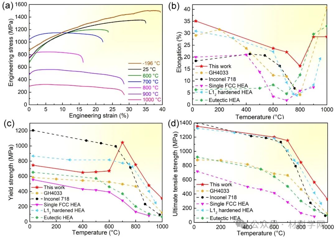 图5 宽温域范围内(-196~1000 °C)力学性能及其与其他合金对比