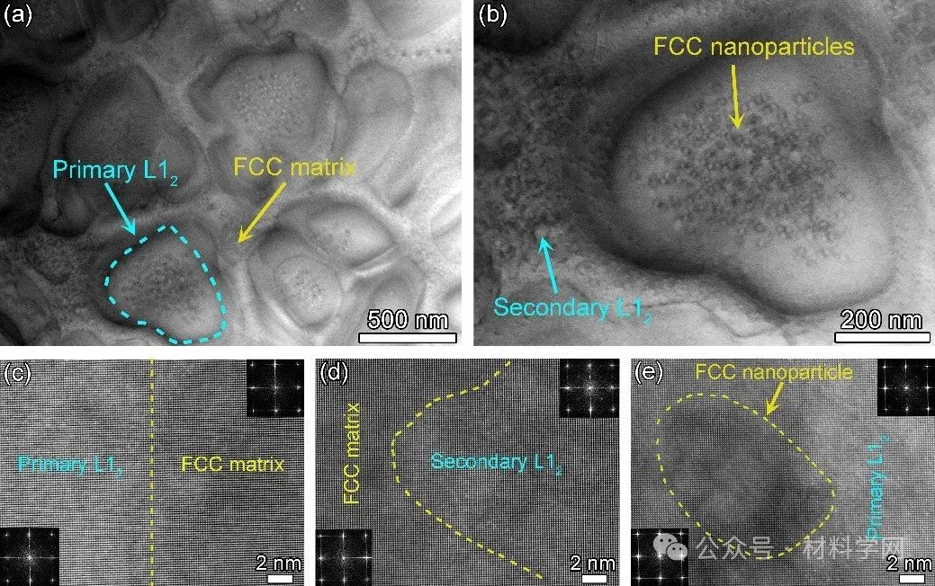 图2 异质L12析出相及其内部反析出FCC相形貌及共格界面