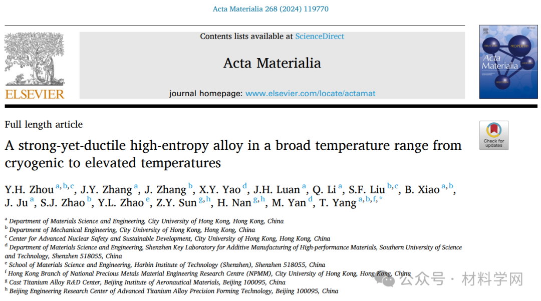 研究背景:为满足极端环境下的使用要求,设计在宽温域范围内均具有优异性能的合金对于航空、航天、低温海洋等先进现代工业尤为重要。然而传统合金的性能通常仅限于特定且相对较窄的温度范围。例如,典型的铁素体和马氏体钢通常在室温下表现出优异的拉伸性能,但在低温下会出现严重脆化,这是由有害的晶界偏析或基体强度高于晶界的强度引起的。泰坦尼克号事件是低温脆化引起的灾难性冶金事故之一。相反,在低温下具有优异性能的合金在高温下往往表现不佳,如奥氏体钢。因此开发在宽温域范围内均具有优异强塑性的合金对于现代工业的发展尤为重要。
