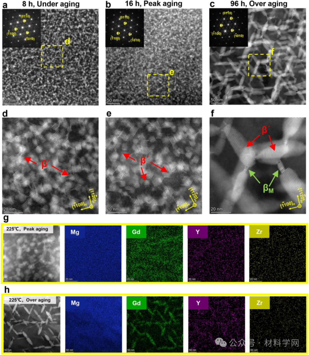 图6所示。不同时效阶段GW93K合金的TEM图像:(a, d)欠时效;(b, e)峰值老化;(c, f)过度老化;(g)和(h)分别为时效峰态和过时效态析出相对应的元素扫描图;