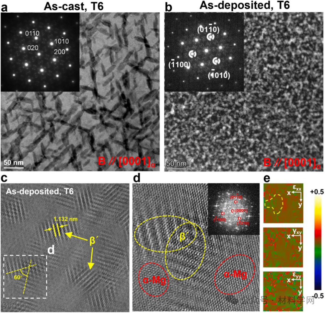图5所示。不同方法制备的GW93K合金的峰时效TEM结果:(a)铸造态和沉积态合金的HAADF-STEM图像和插入SAED图案。(c)沉积合金中析出相的HRTEM图像;(d) (c)中方形区域的放大视图,并插入相应的FFT模式;(e)相应的GPA图