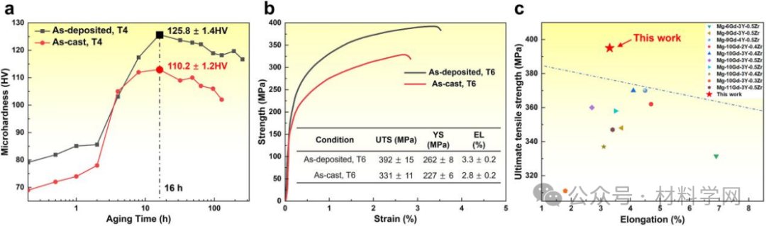 图4所示。GW93K合金力学性能:(a) t4处理合金的时效硬化曲线;(b)拉伸性能;(c)与其他铸造合金的抗拉强度和伸长率的比较