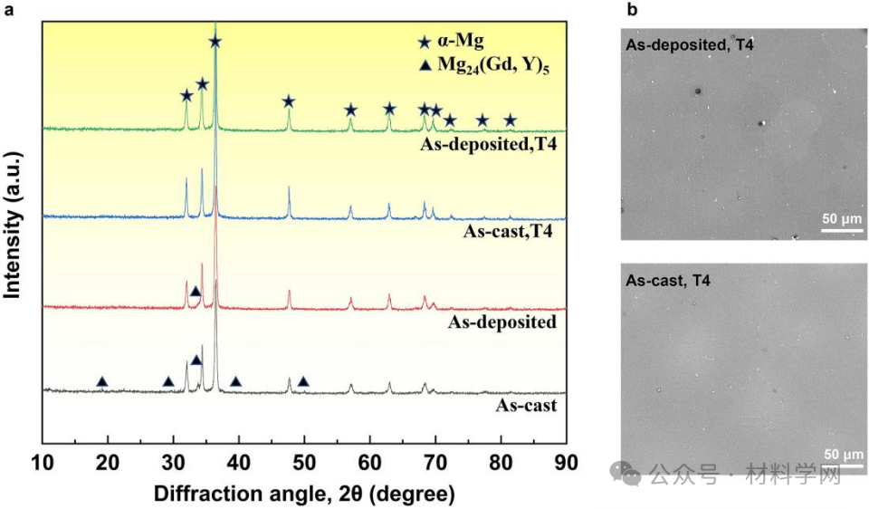 图2所示。(a) T4处理前后GW93K合金沉积态和铸态的XRD谱图;(b)相应的SEM显微图