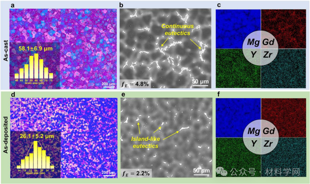 图1所示。铸造态和沉积态GW93K合金的显微组织特征:(a、d)光学显微图和(b、e) SEM显微图,(c、f)上述SEM显微图对应的能谱图。