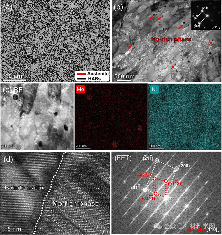 图1。IQ样品的显微结构,(a)含HABs和残余奥氏体的BC图,(b) BF-TEM图,(c) Ni和Mo的EDS图,(d)富Mo相FFT图的HR-TEM图。