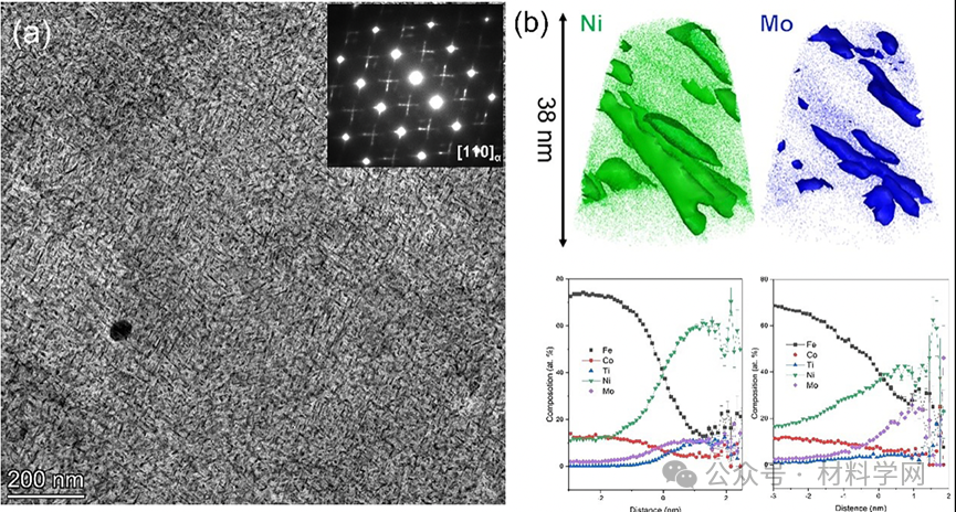 图3。(a) IQ样品老化3 h后的BF-TEM图像及相应的SAED图;(b) 0.35 at的等温线。% Ni和0.1 Mo at。%,以及APT时效3 h IQ样品中Ni3(Ti, Mo)和Mo富集沉淀的接近直方图。
