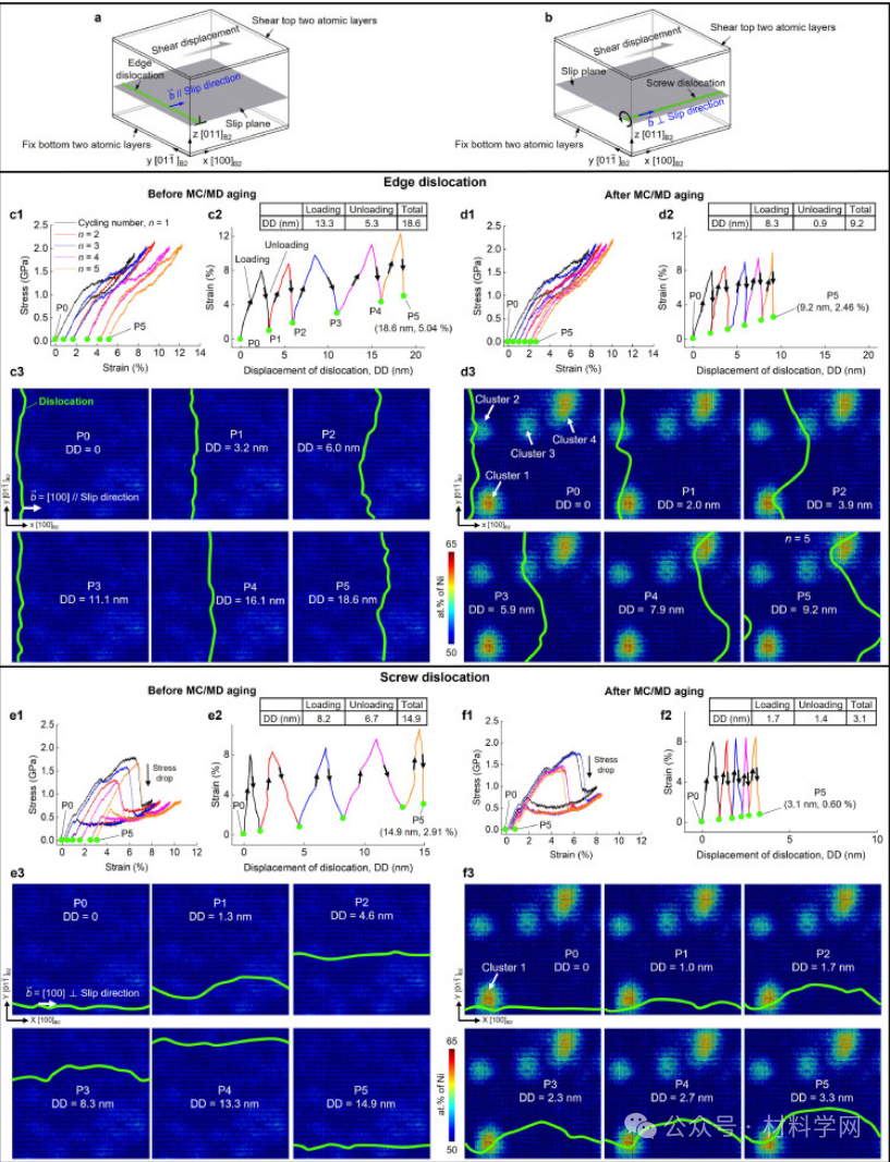 图2. (a)边缘位错和(b)螺旋位错的MD模拟设置。循环剪切的单晶NiTi的MD模拟结果包括(c) (011)[100]B2未时效的边缘位错,(d) (011)[100]B2 LTA后的边缘位错(通过MC/MD在523 K时效1600 ps实现),(e) (011)[100]B2未时效的螺旋位错和(f) (011)[100]B2 LTA后的螺旋位错(通过MC/MD在523 K时效1600 ps实现)。循环剪应力-剪切应变曲线如图c1、d1、e1、f1所示。位错平均位移(DD)与剪切应变的关系为c2、d2、e2和f2。循环前滑移面位错线快照叠加的Ni浓度图(P0)和每个循环结束时(P1 ~ P5)由c3、d3、e3、f3表示。
