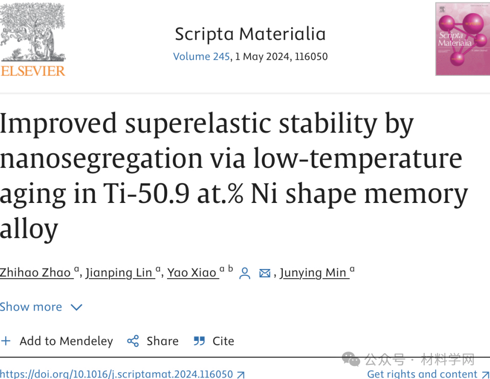 同济大学林建平等教授相关研究以“Improved superelastic stability by nanosegregation via low-temperature aging in Ti-50.9 at.% Ni shape memory alloy”为题发表在Scripta Materialia上。