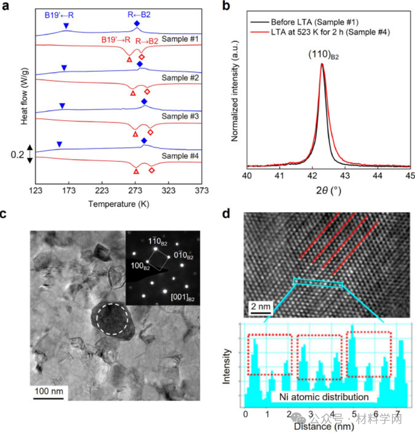 图3 (a)纳米晶Ti-50.9 at的DSC曲线。% Ni样品。(b)纳米晶Ti-50.9 at的XRD谱图。LTA前(样品#1)和LTA后(样品#4)在523 K下加热2小时。(c)样品4的亮场图像。插图是标记晶粒的衍射图样。(d) Ti-50.8 at的HRTEM。在523 K下LTA后的% Ni显示Ni原子沿指定原子阵列的周期性排列表明存在Ni偏析。