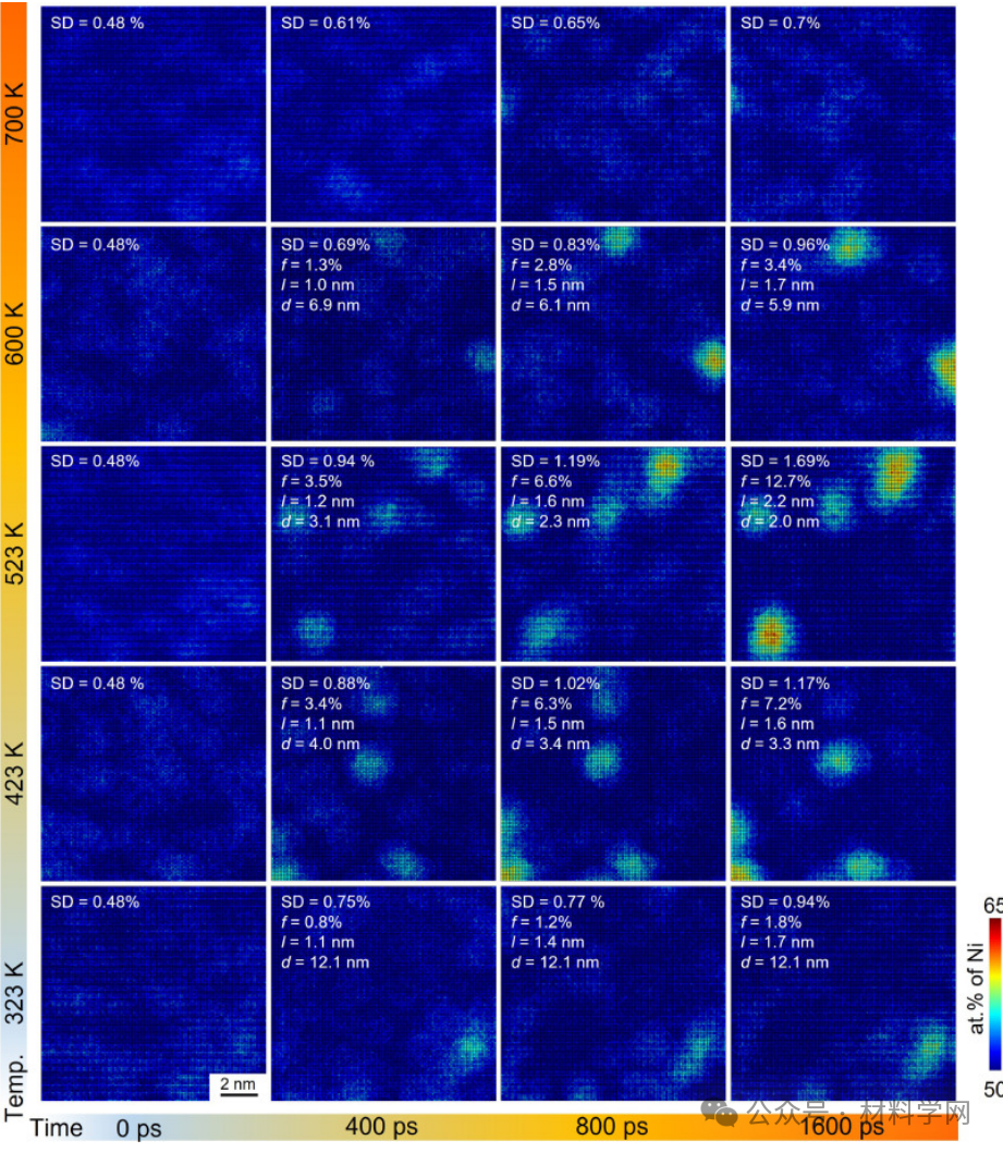 图1所示。MC/MD模拟预测了局部Ni浓度随LTA温度和持续时间的变化。偏析度用SD表示。Ni簇的面积分数、平均尺寸和平均间距分别为f、l和d。在一些图中,由于弱隔离,f、l和d的值缺失。