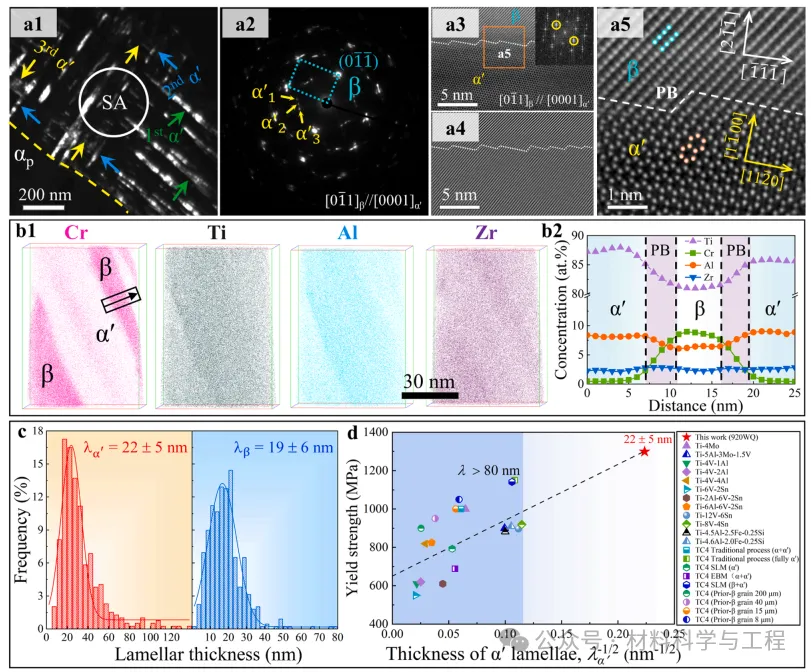 图 2. WQ Ti-2.8Cr-4.5Zr-5.2Al合金的显微组织特征。(a1) 暗视野透射电子显微镜 (DF-TEM) 图像和示意图显示了由 β 和 α′片层组成的β-transus 微观结构。示意图显示了分级有序α′-马氏体组织的显微组织。(a2) 相应的选区电子 (SAED) 图案显示了三种马氏体变体。(a3-a4) 低倍率 HAADF-STEM 和相应的 IFFT 显微照片显示,在 α′/β PB 处没有与错位位错相关的额外平面,以及使用 (011)β 和 (0110)α' 衍射点的 IFFT 显微照片。(a3) 中的插图是相应的 FFT 模式。(a5) 高倍率HAADF-STEM 显微照片显示了传统的“平台-壁架”界面结构,如白色虚线所示。(b1-b2) α′ 和 β 纳米片层的元素分配和组成的 APT 表征。(c) WQ 样品中 α′和 β 片层厚度的统计分布。(d) 目前 Ti-Cr-Zr-Al 合金和其他报道的马氏体 Ti 合金的屈服强度与 α′厚度的关系,包括 Ti-4Mo、Ti-5Al-3Mo-1.5V、TC4 (原β晶粒)、Ti-V-(Al,Sn)系列、Ti-V-Sn系列、TC4传统工艺(α+α′和全α′)、TC4 SLM (α′)、TC4 EBM (α′)和 TC4 SLM (β + α′)。