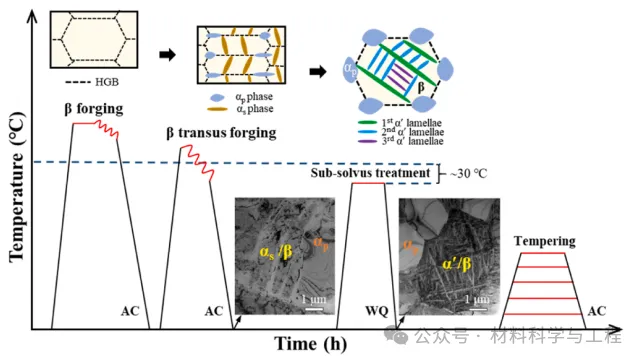 图 1. Ti-2.8Cr-4.5Zr-5.2Al合金的热机械加工方案,以及显示微观结构演变的示意图。显示不同阶段微观结构特征的 Ti-2.8Cr-4.5Zr-2.5Al 合金透射电子显微镜(TEM)图像。