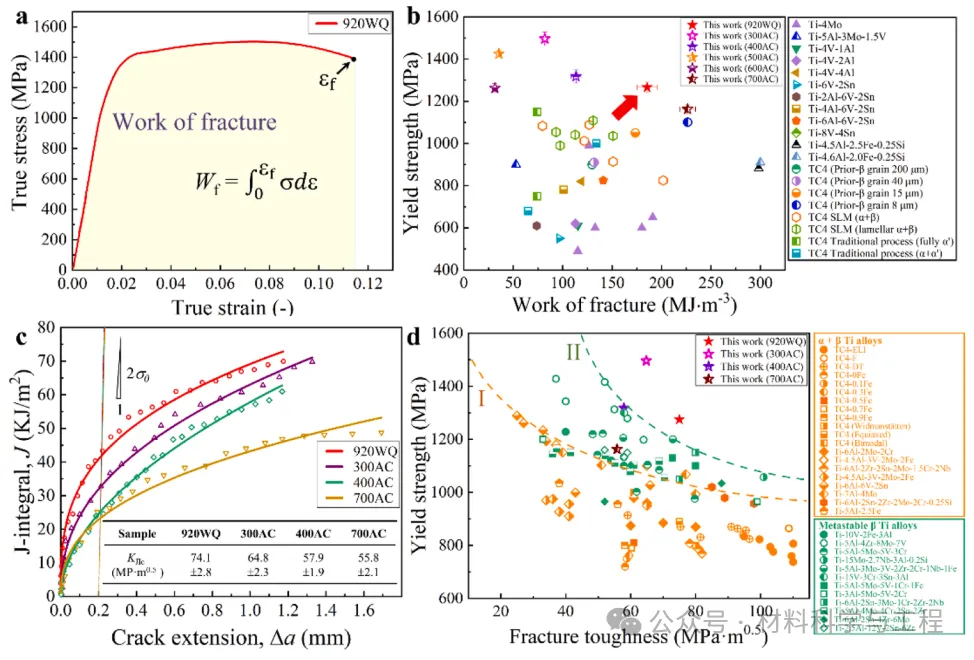 图 7. 钛-2.8Cr-4.5Zr-5.2Al合金的断裂特性。(a) WQ 样品的真实应力-应变曲线显示了断裂功的计算结果。(b) 本研究的钛合金的断裂功与屈服强度的比较,以及已报道的可蜕变钛合金的断裂功与屈服强度的比较。(c) 目前的 Ti-Cr-Zr-Al 合金在不同热处理条件下的 J- 积分断裂抗力曲线。J-R 曲线由单边弯曲试样测得。(d) 本研究的合金与其他典型 α+β Ti 合金(包括 TC4 系列:(TC4-ELI 和TC4-F)和 TC4-DT、TC4-xFe(x = 0.1、0.3、0.5、0.7、0.9)、TC4(Widmanstätten、等轴和双峰结构)和 Ti-Al 系列:(Ti-6Al-2Mo-2Cr、Ti-4.5Al-3V-2Mo-2Fe、Ti-4.5Al-3V-2Mo-2Fe、Ti-7Al-4Mo、Ti-6Al-6V-2Sn、Ti-6Al-2Zr-2Sn-2Mo-1.5Cr-2Nb、Ti-6Al-2Sn-2Zr-2Mo-2Cr-0.25Si 和Ti-5Al-2.5Fe),以及可转移的 β Ti 合金,包括Ti-10V-2Fe-3Al、Ti-5Al-4Zr-8Mo-7V、Ti-5Al-5Mo-5V-3Cr、Ti-15Mo-2.7Nb-3Al-0.2Si、Ti-5Al-3Mo-3V-2Zr-2Cr-1Nb-1Fe、(Ti-6Al-2Sn-3Mo-1Cr-2Zr-2Nb、Ti-5Al-5Mo-5V-1Cr-1Fe、Ti-15V-3Cr-3Sn-3Al和Ti-3Al-5Mo-5V-2Cr)以及(Ti-5Al-4Mo-4Cr-2Sn-2Zr、Ti-6Al-2Sn-4Zr-6Mo和Ti-2.5Al-12V-2Sn-6Zr)