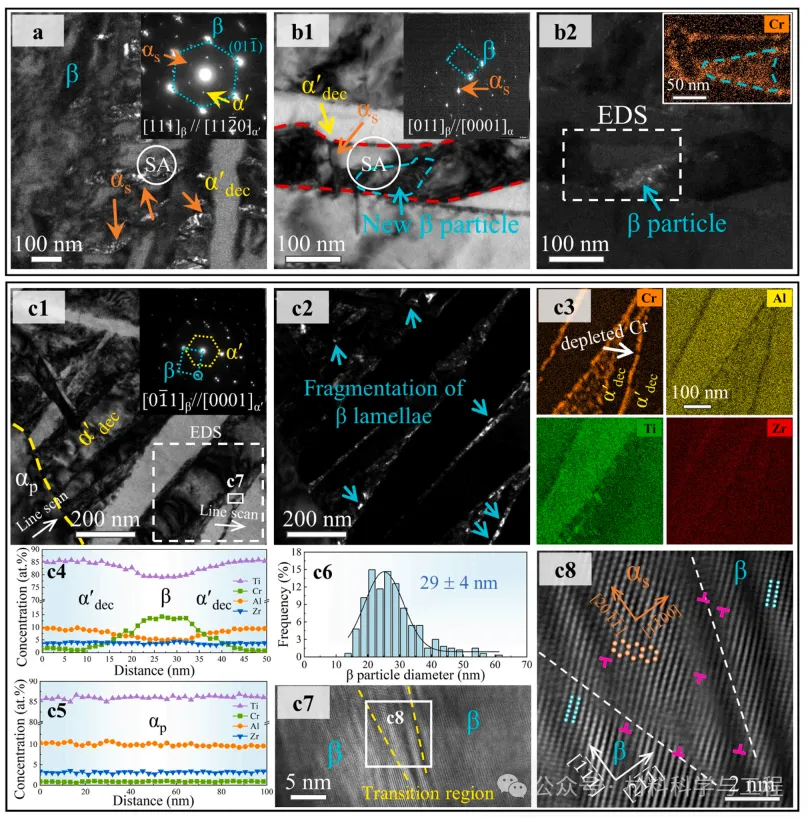 图 4. 500AC Ti-2.8Cr-4.5Zr-5.2Al 合金的微观结构特征。(a) DF-TEM 图像显示了大量次级 α,用橙色箭头表示。(b1-b2)BF-TEM 和相应的DF-TEM 图像显示在分解的 α′ 片层中新形成的 αs和 β 纳米颗粒。还提供了相应的铬元素 EDS(插图)。(c1) BF-TEM 图像显示了 500℃ 回火后的β-横截面微观结构。(c2)相应的DF-TEM 图像显示了先前的 β 分裂 β 二维小板和纳米级 β 颗粒。(c3)相应的 EDS 图谱显示了 Ti、Al、Cr 和 Zr 的分布以及白色箭头所示的贫化 Cr 区。(c4-c5)显示了(c1)中标记线的EDS 线分析。(c6)500AC 样品中 β 颗粒直径的统计分布。(c7) HR-TEM 图像显示了具有显著晶格应变的过渡区域。(c8) HR-TEM 图像显示过渡区内出现了新的αs 相,αs/β 与 BOR 的界面上出现了一些错配位错。