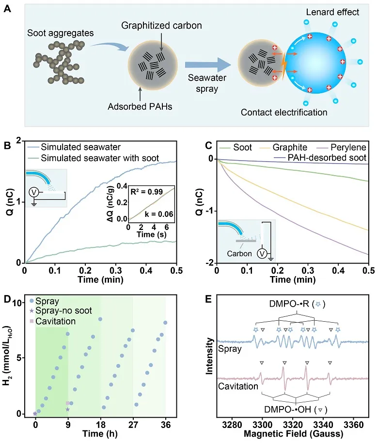研究将碳烟作为惰性火成碳的代表性组分,被选为该工作的研究对象。他们首先通过研究海水微液滴与碳烟之间的电荷转移过程,发现海水微液滴的水-汽界面与水-碳界面之间存在电势差,进一步通过确认对碳烟氧化生成碳自由基和海水产氢反应,推测出碳烟在雾化海水中发生了电偶腐蚀(图1)。