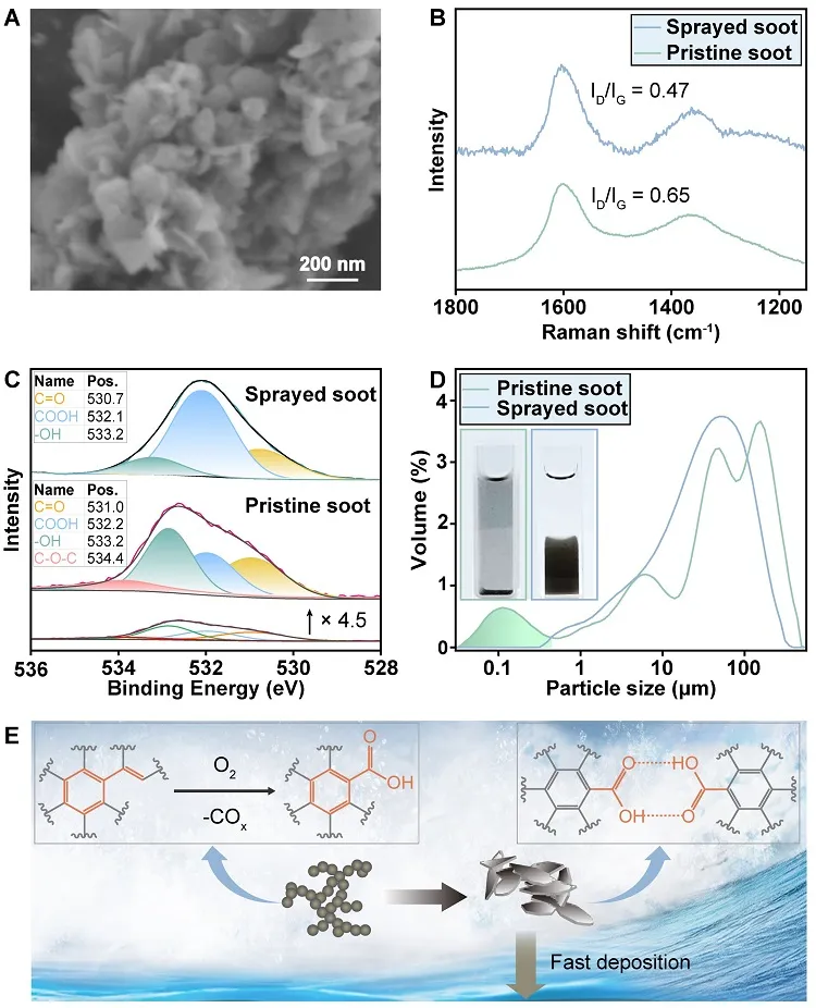 最后,该研究发现海水微液滴还能够导致碳烟的快速沉降(图3)。与微液滴反应后的碳烟石墨化程度提高,缺陷减少。同时生成羟基(-OH)、羧基(-COOH)等官能团,表明稠环芳香结构边缘缺陷处发生了氧化降解。经过以上化学变化,球型碳烟颗粒组成的松散结构转变成了致密的片状堆积结构,促进了碳烟的快速沉降。