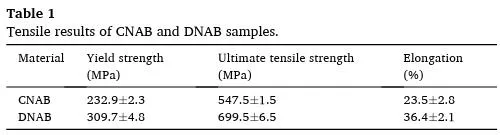 (2) 虽然DNAB的残余应力略高于CNAB,但CNAB样品中的β′相和粗κ相更有利于裂纹的产生和扩展。因此,与CNAB相比,DNAB样品的极限拉伸强度提高了约27.76%,伸长率提高了54.89%。