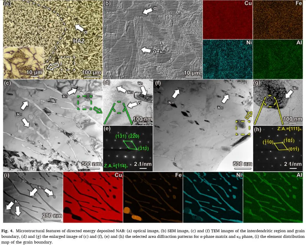图4显示了DNAB的微观结构特征。如图4a所示,DNAB的微观结构由α相基质和树突间区组成,光学图像中未发现明显的沉淀物。在DED生产的样品中,存在一个以相对粗糙的微观结构为特征的区域,通常称为热影响区(HAZ)。图4b显示了树突间区域的层状沉淀。与CNAB相比,DNAB具有显著精细的微观结构(图4b)。与图4b相对应的元素分布图显示,DED生产的样品中没有明显的元素偏析。树突间区和晶界的更多细节分别如图4c和图4f所示。细小的层状和球状沉淀物出现在树突间区(图4c)。在边界处可以找到一些粗球状沉淀物(图4g)。