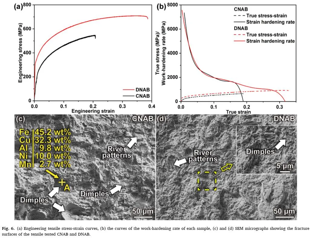 图6a显示了CNAB和DNAB样品沿纵向的工程拉伸应力-应变曲线。表1总结了样品的拉伸结果。与CNAB结果的比较表明,DNAB的0.2%屈服强度(YS)和极限拉伸强度(UTS)分别从(232.9±2.3)MPa显著提高到(309.7±4.8)MPa和从(547.5±1.5)MPa提高到(699.5±6.5)MPa。同时,DNAB的伸长率(36.4%±2.1%)明显更高,与铸造样品(23.5%±2.8%)相比增加了53.89%。图S1和表S1显示,样品在横向和纵向上的强度和延展性差异并不显著。由此可见,CNAB和DNAB样品的力学性能均不具有显著的方向性。