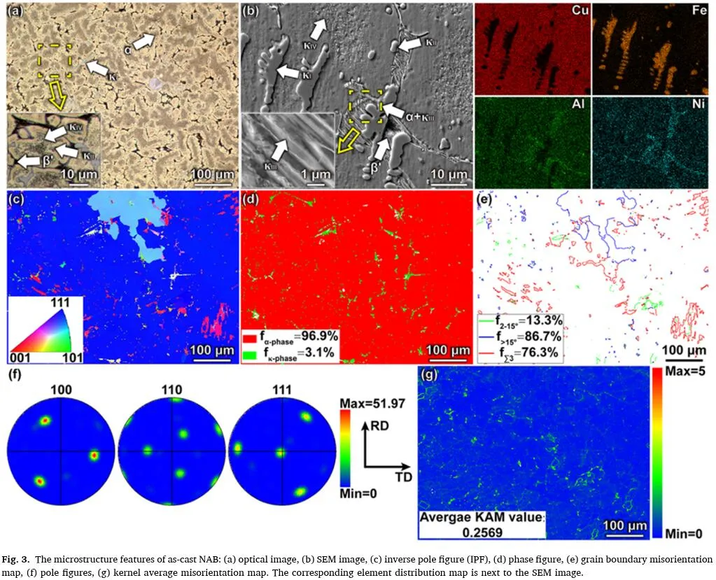 图3显示了CNAB的微观结构。如图3a所示,通过OM观察在CNAB中观察到α相基质(亮区)、树突间区(暗区)和一些沉淀物。图3b中的SEM观察揭示了CNAB的细节。CNAB的微观结构由粗α相基体、高温残余β′相和各种κ相组成。根据元素分布和形态,κ相可分为四种形状。CNAB的反极坐标图(IPF)如图3c所示。其余颜色表示中间方向。晶粒表现出明显的粗α相基质(蓝色)向<111>生长方向的趋势,这是FCC晶粒的常见生长方向。相图(图3d)表明α相基体(红色)的体积分数为96.9%,金属间κ相(绿色)的体积分数为3.1%。图3e显示了晶界取向错误。CNAB中α相矩阵的极性图(PF)如图3f所示。CNAB 具有强烈的 (100) <111> 质地。CNAB的最大纹理指数为51.97。图3g显示了CNAB的核平均取向错误(KAM)图。CNAB的平均KAM值为0.2569。