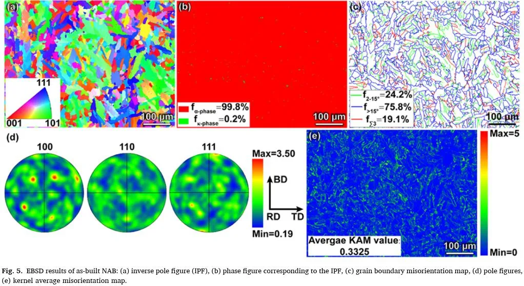 图5显示了DNAB沿构建方向的晶体学特征。从图5a可以看出,DNAB的IPF显示了晶粒结构,没有任何明显的晶粒取向。图5b显示了DNAB的相图,其中α相基质占99.8%,金属间κ相仅占0.2%,表明DNAB中κ相的含量明显低于CNAB(3.1%)。晶界位错图如图5c所示,与CNAB相比,DNAB表现出更高的LAGBs比例,增加到24.2%,并且观察到孪生边界的范围显着降低(∑3)。DNAB的PF如图5d所示。可以看出DNAB的最大织构强度(3.5)明显低于CNAB(51.97)。