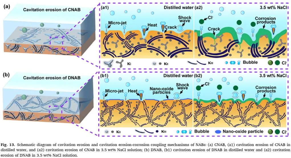 图13显示了NAB合金蒸馏水和3.5 wt% NaCl溶液中的空蚀机理。如图13a1和b1所示,样品表面受到微射流和气泡耗散产生的热量的影响。硬κ相比α相具有更好的抗空化侵蚀能力。因此,CNAB的汝合结构中的部分软α相基质和α相在初始阶段被破坏以分离。此外,由于构造结构中κ3和α相的分离。相位比其他κ相更容易被破坏。最终,如图13a1所示,当硬κ相在长时间撞击后坍塌时,会产生大空腔。许多小空腔在冲击过程中合并形成大孔隙。相反,由于DNAB的微观结构更均匀,它在表面所有部位都表现出相似的机械力承载能力,并且在损伤后表面相对平坦(图13b1)。CNAB较粗糙的表面比DNAB的平坦区域承受更高的应力水平,导致疲劳裂纹在这些区域成核和生长。因此,DNAB表面的变形更加均匀,从而减少了空腔。