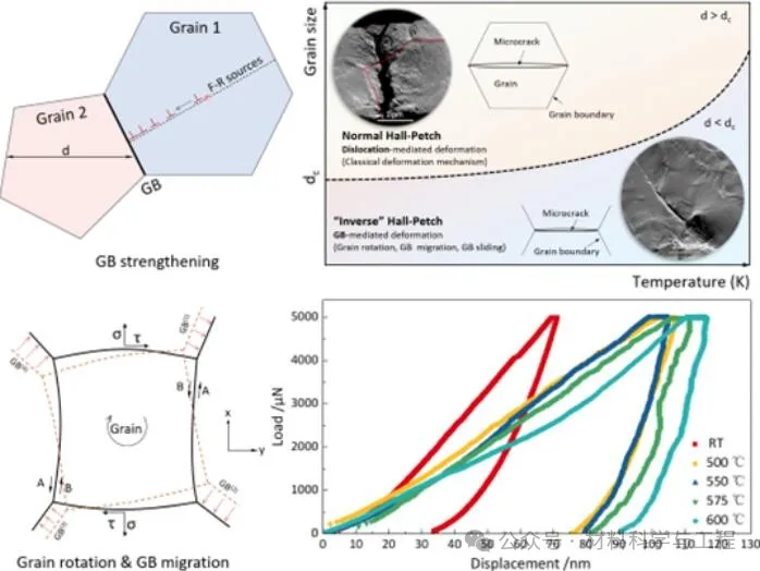 图6 室温或较低温度下Hall-Petch关系和高温下的Inverse Hall-Petch关系示意图及转变机制。(a) 室温或较低温度Hall-Petch强化示意图,(b) Hall-Petch 向 Inverse Hall-Petch转变的临界尺寸dc随温度变化的示意图,(c) 高温晶粒和晶界软化机制示意图,(d) 室高温纳米压痕载荷位移曲线。