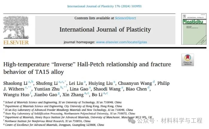 该发现为提高金属材料的高温力学性能提供了新的思路,有望为提高多晶金属材料高温力学性能的开发提供重要理论基础与科学指导。相关成果以“High-temperature “Inverse” Hall-Petch relationship and fracture behavior of TA15 alloy”为题发表于工程塑性领域顶级期刊《International Journal of Plasticity》上。论文第一作者为西安理工大学2022级博士生李少龙,现香港城市大学联合培养博士生。通讯作者为西安理工大学李树丰教授、香港城市大学朱运田教授(联合培养导师)和英国曼彻斯特大学Philip J. Withers教授。