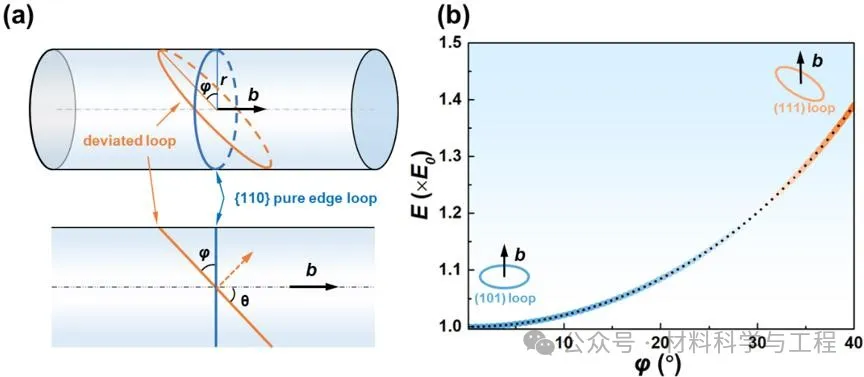 为了理解位错环的取向分布特征及其偏转驱动力,研究团队基于位错弹性应变能计算得到图7所示位错环的能量E在偏转角φ = 0° - 40°范围内的变化,发现偏转角在0° - 20°范围内位错环的应变能E随偏转角φ的增大而增加的程度较为缓慢,表明纯刃位错环的取向相对于其{110}惯习面在小角度范围内相对容易发生偏转,计算结果与偏转角的分布特征相吻合。综合位错环三维定量表征和原位加热实验结果,研究团队揭示了位错环取向的偏离机制(图8)。具体而言,在室温或低温下,位错环主要通过靠近{111}滑移面的四段局部位错在以环为底、Burgers矢量为轴的柱面上相互协同运动,导致了三种以不同方向为轴偏离其惯习面的位错环。高温下,位错的攀移运动机制被有效激活,此时位错环发生收缩和多边化,使其四个位错段靠近{111}滑移面分布,进而在四个靠近{111}滑移面的位错段持续竞争和协同运动下形成具有三种取向偏转行为的偏离惯习面的位错环。