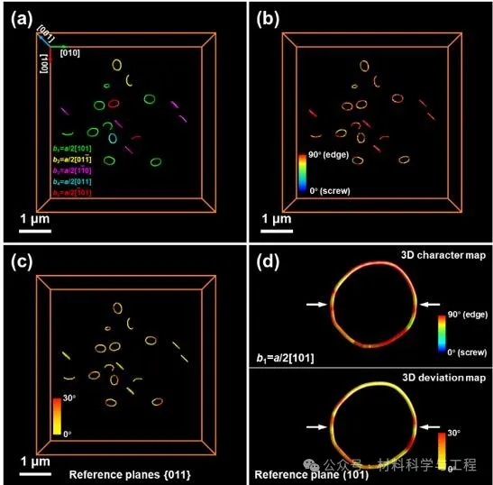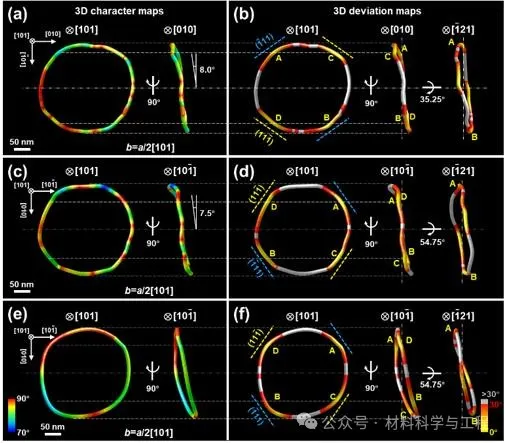 采用位错组分和偏离特征三维可视化技术分别展示了以[010]、[10-1]和不规则方向为转动轴、相对于惯习面发生偏转的位错环的三维晶体学特征(图3)。根据图2和图3所示位错环取向分布特征,将位错环相对于惯习面的偏离行为分为Type I、II和III三类,对应转动轴分别为<100>、<110>和不规则方向。