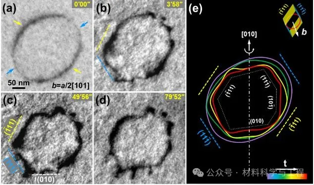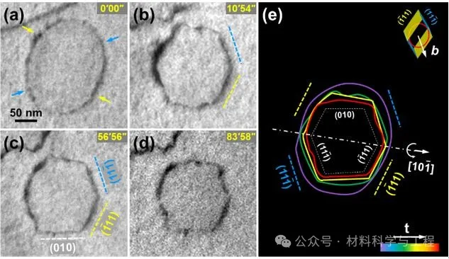 位错环是晶体材料中的常见缺陷,通常形成于淬火、辐照或变形等过程中,对材料的诸多性能具有重要影响。早期研究发现,淬火Al-Cu合金中的全位错环位于{110}惯习面上,具有a/2<110>型Burgers矢量,但同时也发现在淬火纯铝及铝合金中也存在位于{111}、{110}、{012}和{032}等晶体学面的多种取向的位错环,据此部分学者认为位错环可能位于{110}至{111}之间的任意取向,并且之间可能存在相互转化。目前,已有研究基于原位退火实验证实了位错环取向可以发生偏转,并认为其驱动力来源于不同取向位错环能量的差异,在此基础上构想出了一些位错环取向偏转的动态机制。然而,这些偏转机制并未从实验上得到直接证实,主要原因在于传统位错表征方法难以获得位错环准确的三维结构和晶体学信息,无法将位错环的三维晶体学特征与动态演化行为进行关联分析。