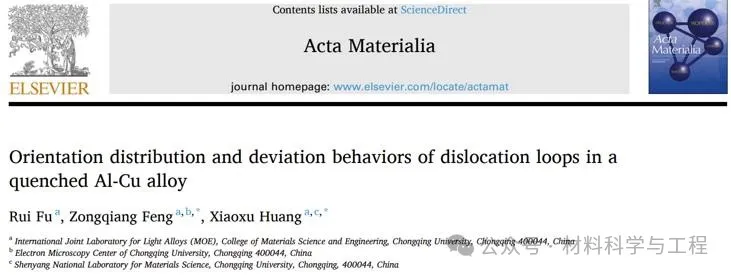 针对上述问题,重庆大学黄晓旭团队采用自主开发的位错晶体学三维表征技术定量揭示了位错环的三维特征,并结合透射电镜原位加热方法,将位错环的三维晶体学和几何学参数特征与动态演化行为进行了详细耦合分析,系统揭示了淬火Al-Cu合金中位错环的取向偏离特征和偏转机制。相关研究成果以题为“Orientation distribution and deviation behaviors of dislocation loops in a quenched Al-Cu alloy”发表在金属材料领域期刊Acta Materialia上。重庆大学冯宗强教授和黄晓旭教授为论文的通讯作者,博士生符锐为论文第一作者。