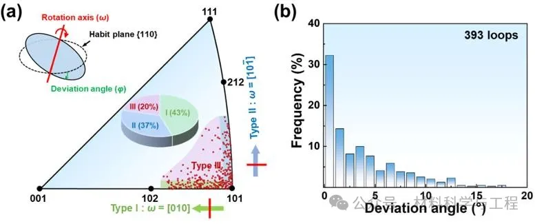 该研究以淬火Al-Cu合金中位错环为对象,采用位错晶体学三维表征技术对600多个位错环进行系统的三维晶体学定量研究,采用位错组分和偏离特征三维可视化技术直观呈现了位错环处刃/螺组分和偏离惯习面特征的三维分布(图1)。基于位错晶体学三维表征结果,研究团队确定了457个位错环所处晶面(或位错环取向)信息(图2a),结果显示位错环取向集中分布于反极图的[101]-[001]边和[101]-[111]边附近,理论上相当于{110}位错环分别以[010]和<110>轴发生转动偏离了其惯习面。基于位错环的取向计算了相对于对应{110}惯习面的偏离角(图2b),结果显示位错环出现的频率随着偏离角度增大而单调降低。