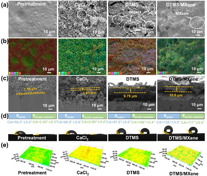 图4 MXene复合涂层酸性条件下浸泡后的表面形貌、润湿性及化学组成分析