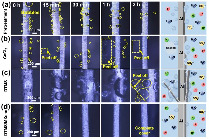 原位腐蚀实验证明MXene复合涂层能够有效阻隔酸性介质的渗透,对Al合金的腐蚀有明显抑制作用。同时,原位实验12h,涂层仍覆盖完整,与基体结合良好。对比涂层在实验2h出现剥离现象。