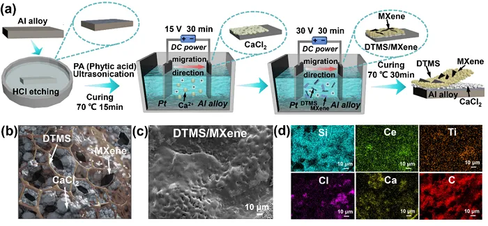 在酸性溶液中浸泡后,对比样品涂层表面出现明显孔洞和剥离,MXene复合涂层仍呈现完整覆盖。同时,润湿性测试表明MXene复合涂层对水和酸性液体仍呈现高疏水性。表面化学组成分析结果说明Ce3+和MXene在涂层腐蚀防护中起到关键作用。