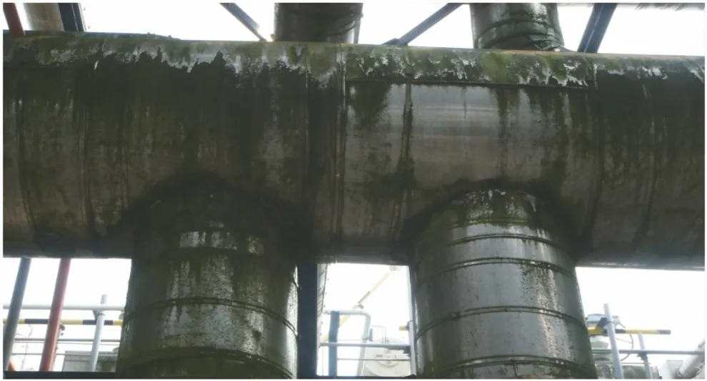 3 管道保冷层失效,最外层金属保护层外壁长期凝水,凝结水不断地滴落到钢构架和基面,局部钢构架已经出现了层状腐蚀,厂区管廊架的腐蚀对支撑管廊的安全性产生较大的影响;
