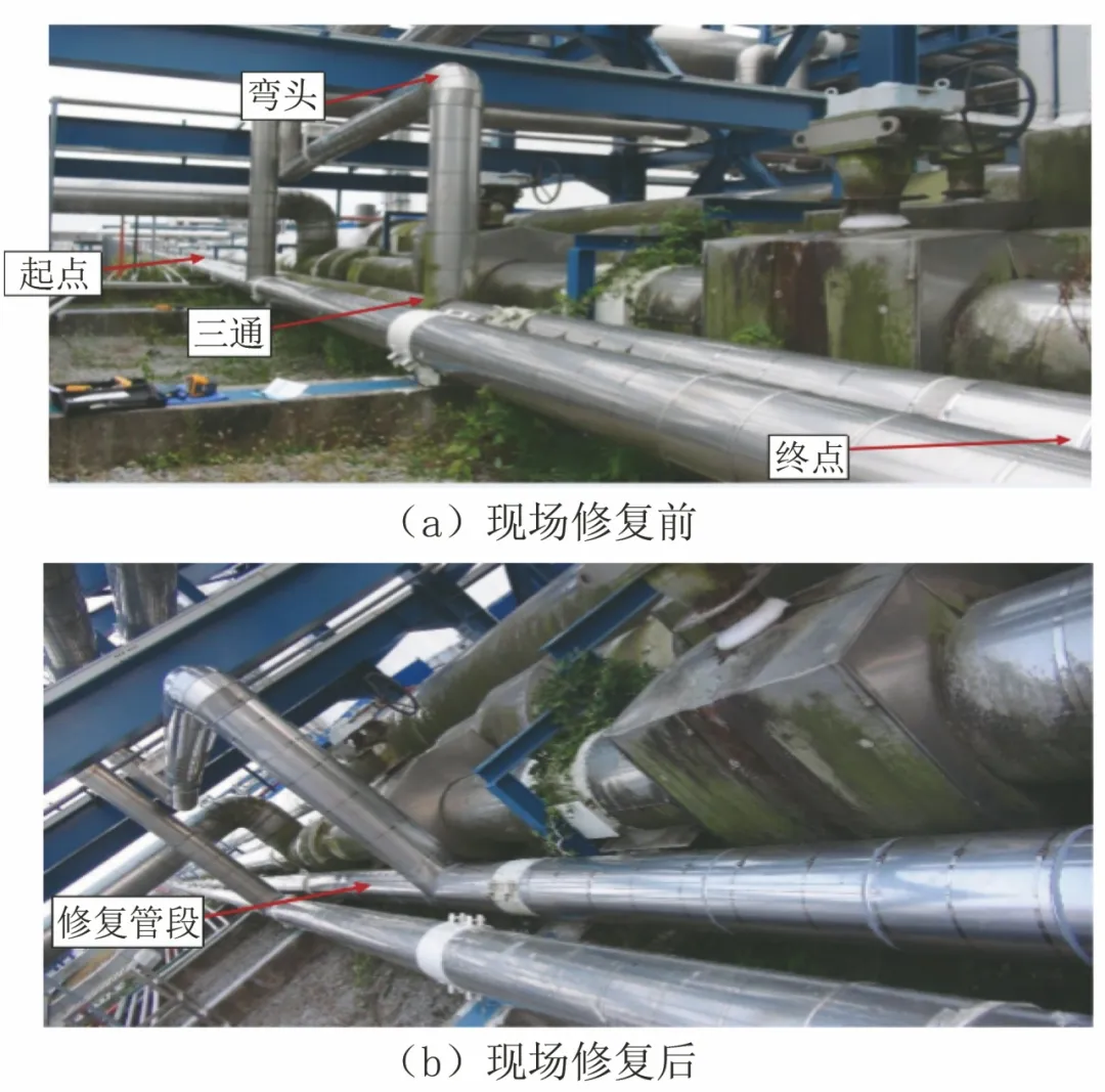 1 修复前保冷系统外表面腐蚀、长苔藓、滴水情况严重,部分管段金属外保护层开裂,修复后系统运行一周,保冷系统外表面无凝霜、滴水现象。