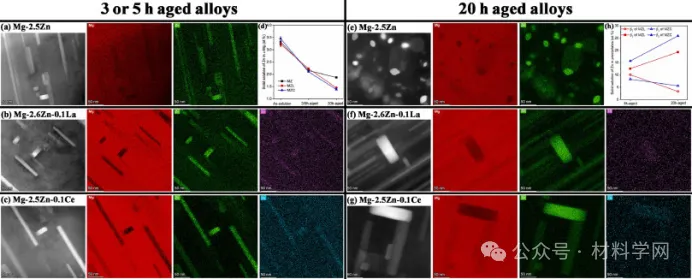 图13所示。三种Mg-Zn-La合金在200°C时效(a-c) 3或5 h, (e-g) 20 h的HAADF图像,以及(d)基体和(h)第二相Zn原子浓度。