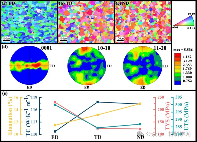图6所示。(a-c)组织,(d)织构,(e)挤压态Mg-5.0Zn-1.1Mn合金的力学性能和导热系数。