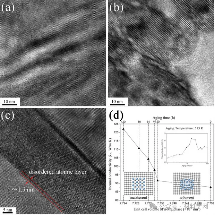 图12所示。498k时效(a) 4h, (b) 24h, (c) 300h的Mg-12.0Gd合金基体与相界面;(d)单元胞体积与导热系数的关系。