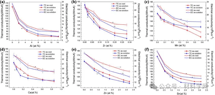 图4所示。研究了6种二元镁合金在铸态和固态以及(a-f) Mg- al、Mg- zr、Mg- mn、Mg- ca、Mg- zn和Mg- sn合金的导热系数和电导率。
