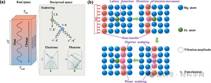 图3所示。(a)固体传热示意图[76],(b)晶格中Zn原子在传热过程中对电子和声子的散射。