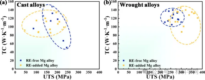 图14所示。近年来高性能(a)铸造镁合金和(b)变形镁合金的发展现状:蓝点为无re镁合金,黄点为添加re镁合金。