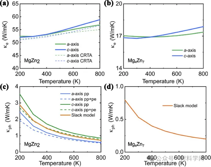 图2所示。(a, b) MgZn2和(b, d) Mg4Zn7的电子导热系数和(c, d)声子导热系数。