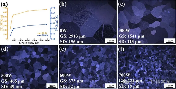 图7所示。(a)晶粒尺寸对纯Mg室温和低温导热系数的影响,以及(b-f)相应的显微组织。