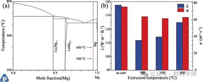 图5所示。(a) Mg-La相图,(b)不同挤压温度下Mg-La- zn - zr合金的TC和热扩散系数。