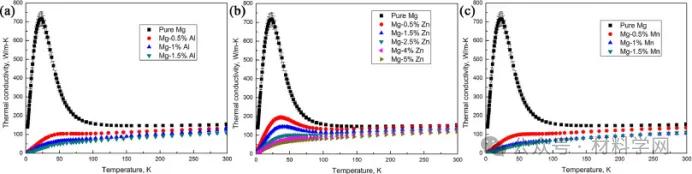 图11所示。(a) Mg- al, (b) Mg- zn, (c) Mg- mn合金在0-300 K温度范围内的导热系数随温度的变化。