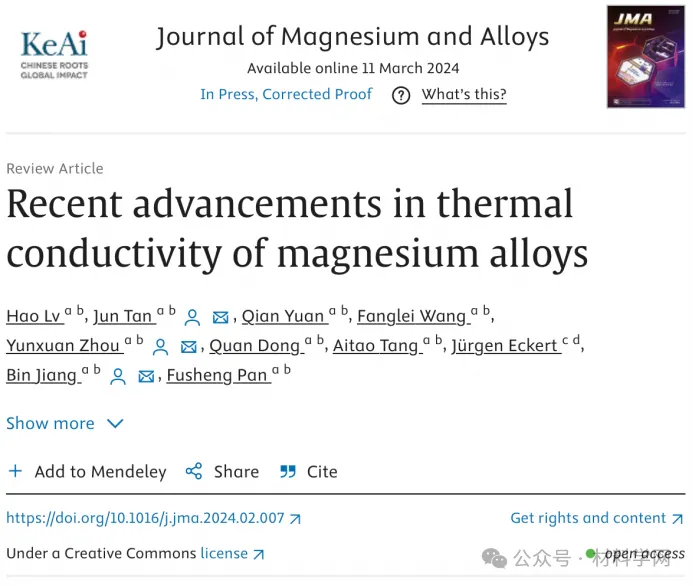 相关研究成果以“Recent advancements in thermal conductivity of magnesium alloys”发表在 Journal of Magnesium and Alloys上。